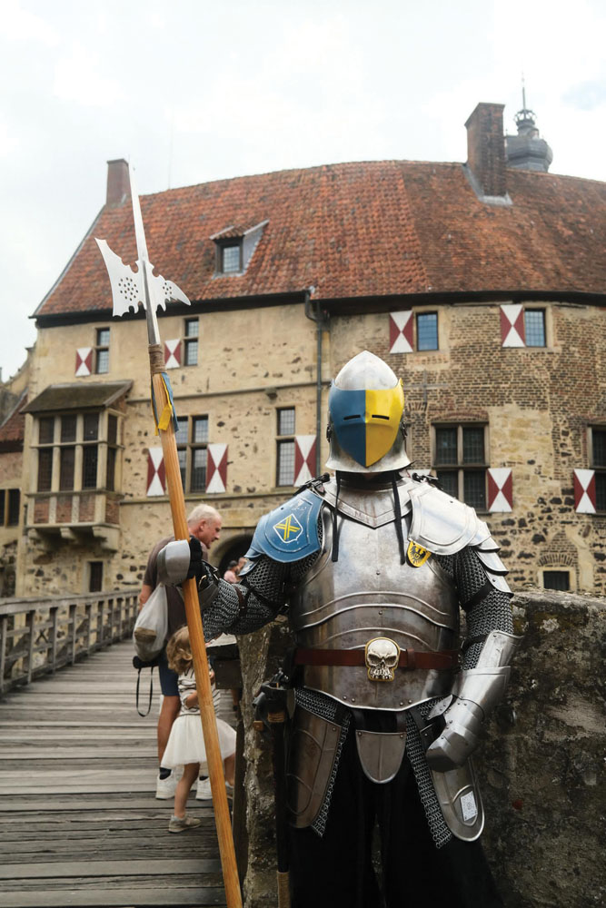Ihre Panzer, Waffen und Gewänder haben die Vier kreativ zusammengestellt. »Die Kostüme sind vielleicht nicht historisch korrekt – aber es sind unsere.« Wobei – auf den Märkten und Festivals, wo häufig auch Drachen und Trolle ihr Unwesen treiben, nehmen es die meisten Gäste mit der Authentizität ohnehin nicht so genau. Hier geht es ums Fallenlassen, Eintauchen, Mitmachen. Das Mannschaftsoutfit mit blau-gelbem Wappenrock und Castroper Stadtwappen ist zudem ein echter Eyecatcher, was beim Mittelalterevent 2024 sogar dem Bürgermeister ins Auge fiel. »Er wollte direkt ein Selfie mit uns machen, und das war eigentlich der erste Schritt zu einer offiziellen Stadtwache für Castrop-Rauxel.«